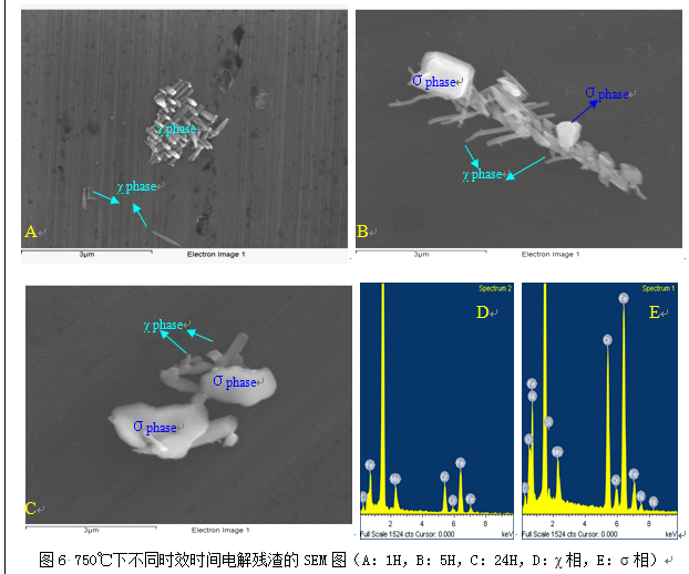 圖5是試樣在750 ℃時效不同時間電解殘雜的XRD圖譜,反映了在同一時效溫度下,隨著時間的延長,析出相的形成和變化。在時效1 h后,析出相主要是以M23C6和Cr2N為主,并有少量的χ相;到2 h,χ相開始增多;5 h以后則有部分σ相出現,而后伴隨著時間的延長,σ相越來越多,相應χ相開始減少,到24 h時,σ相已經占主導地位,且形成的晶體很完整,XRD圖譜峰和清晰明顯。該過程可以描述為:M23C6,Cr2N,χ相→χ相,Cr2N,M23C6→χ相,Cr2N,σ相→σ相,χ相。M23C6的析出導致相界附近的鐵素體相內鉻的損失,鐵素體內的貧鉻促進原始α/γ相界向鐵素體晶內遷移,釋放出多余的鉻給鄰近的鐵素體相,為金屬間相形核創造了條件[11-12]。圖6是 750 ℃下不同時效時間電解殘渣的SEM觀測,通過能譜分析可知,圖中針狀(刺狀)的部分主要是含Fe, Cr, Mo,不含Ni;而塊狀的部分主要含Fe, Cr, Mo, Ni, Si,初步可認定其為σ相。該SEM圖的表征與圖6中XRD定性的結果相吻合,顯示了金屬間相從χ相到σ相的變化,圖6A為750 ℃下時效1 h,此時的金屬間相為針狀(刺狀)的χ相;而圖6B為750℃下時效5 h,此時的金屬間相以χ相為主,同時含σ相;圖6C是750 ℃下時效24 h,金屬間相以σ相為主,同時含少量的χ相。從SEM的檢測可知,在同時含χ相和σ相的過渡階段,χ相和σ相并不是獨立分開的,兩者是共存的,可以初步認定σ相是在χ相的基礎上形成的。而圖6D,7E分別是針狀(刺狀)和塊狀區域的能譜圖,前者主要是含Fe, Cr, Mo,不含Ni;而后者主要含Fe, Cr, Mo, Ni, Si,。
